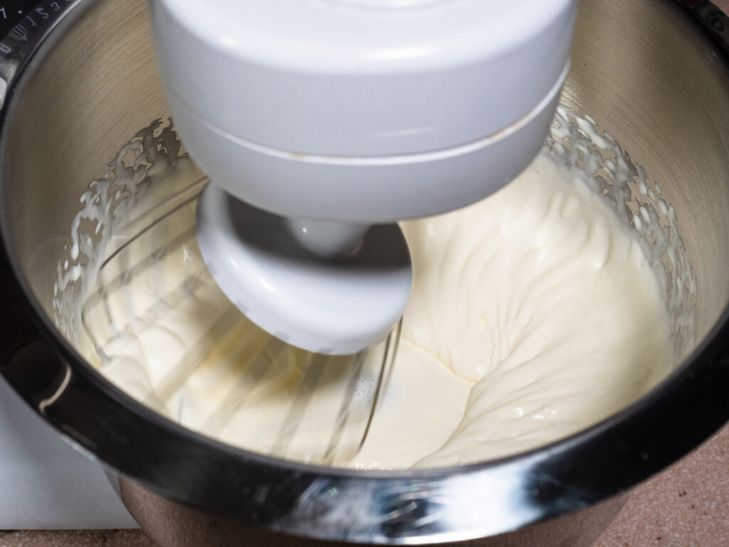 - Schłodzony serek mascarpone, cukier oraz schłodzoną masę waniliową umieszczamy w misie miksera i miksujemy na najwyższych obrotach do momentu otrzymania gęstego kremu.