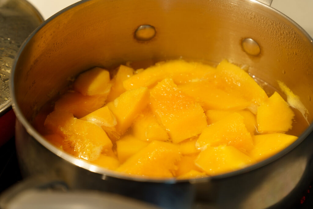 - Mrożone mango umieszczamy w garnuszku i podgrzewamy na średnim ogniu aż owoce się rozpadną.